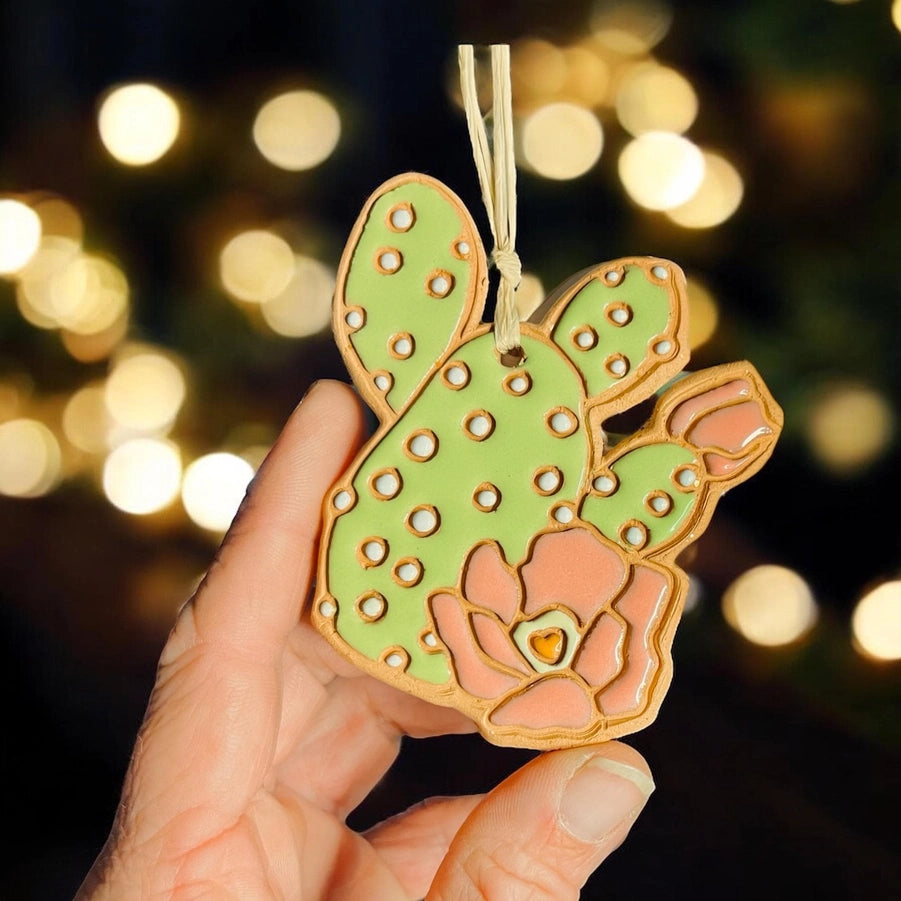 Southwest charm meets holiday cheer in this vibrant cactus ornament, handmade from natural clay and glazed in soft desert hues. Each piece is crafted by hand — cut, detailed, and painted in small batches — giving every ornament its own distinct personality and texture. The glossy cactus pads and delicate pink bloom bring a playful nod to the desert landscape.