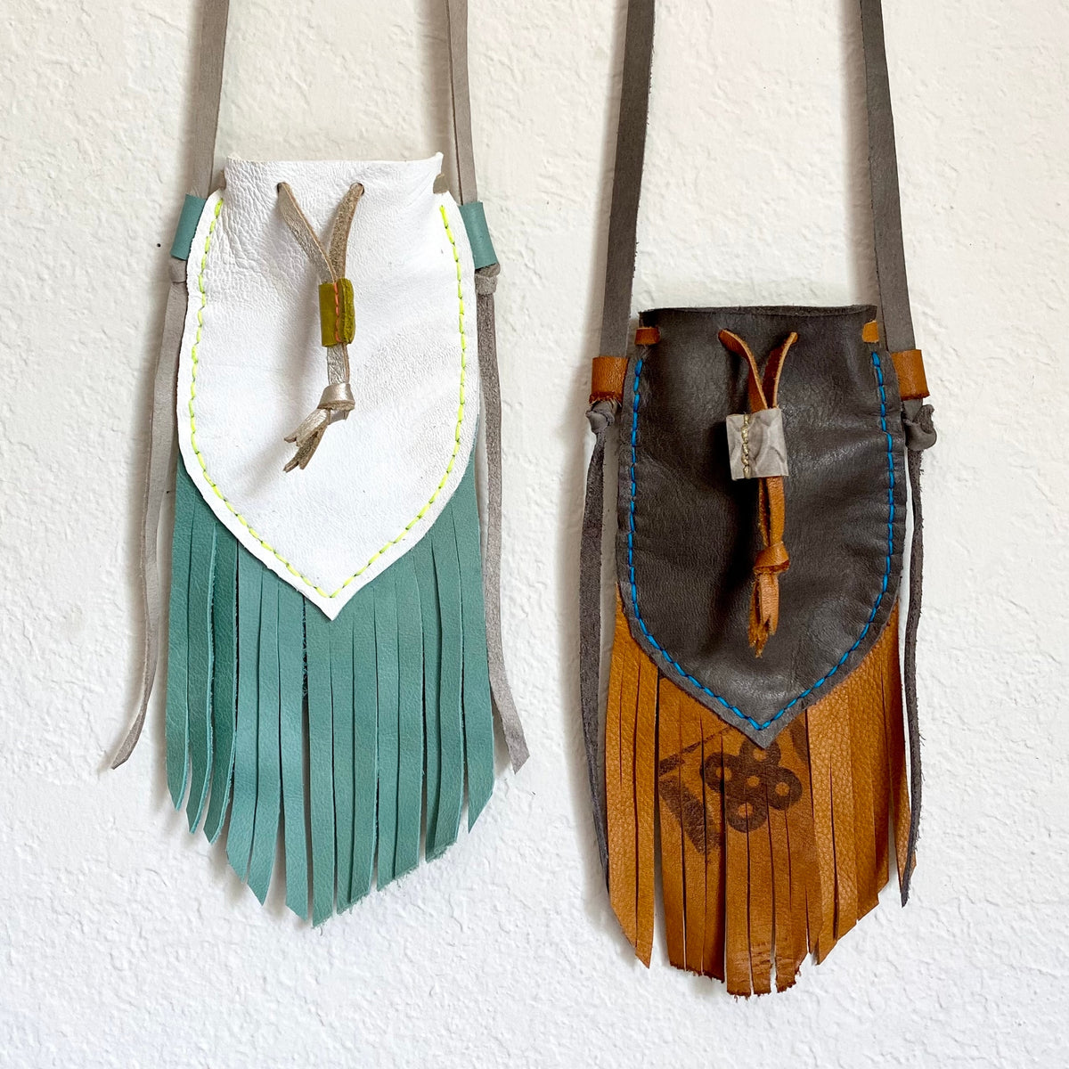 p.s. - Makers Note // No 2 bags will look exactly alike. These are made from leather scraps on hand. If you're looking for something specific, please let us know.