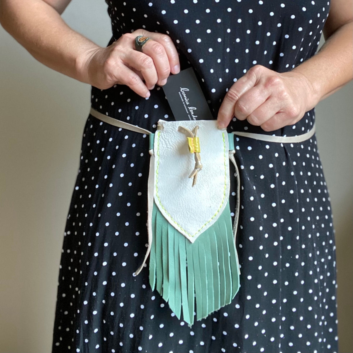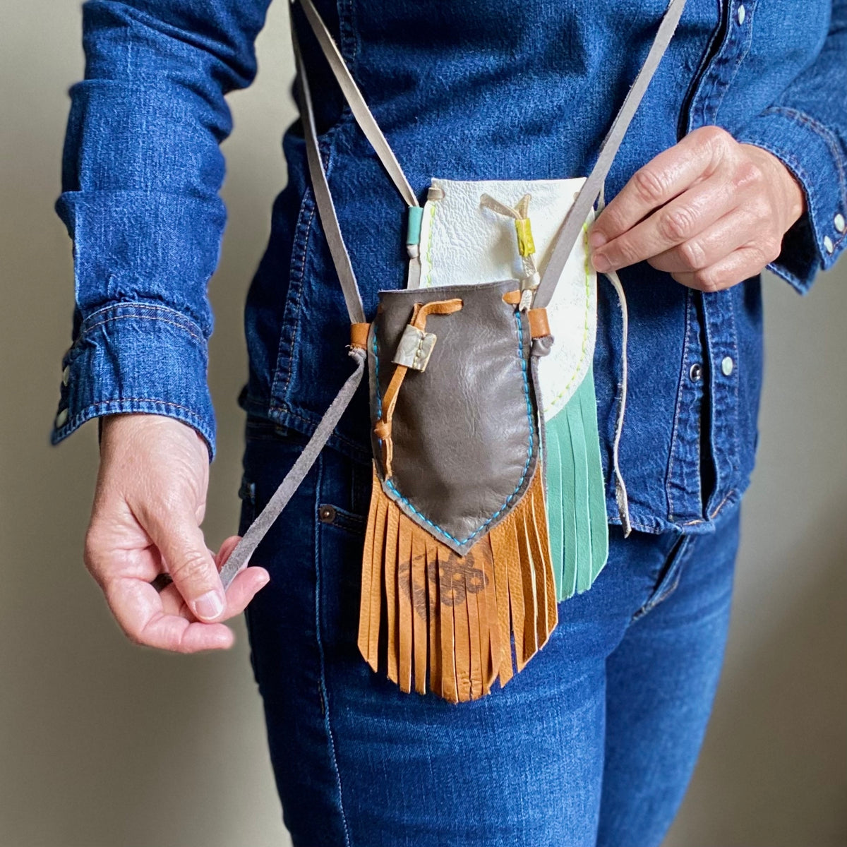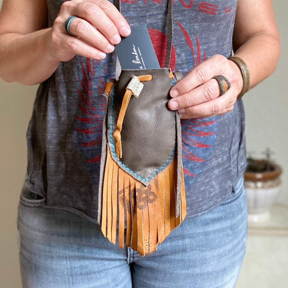 This leather neck pouch or lanyard is full of bohemian, eclectic, and even Southwestern vibes. This little gem, The Wanderer, is a miniature bag with fringe. It'll go with you on your journey wherever that may take you. Demure and petite. Functional. Fabulous.