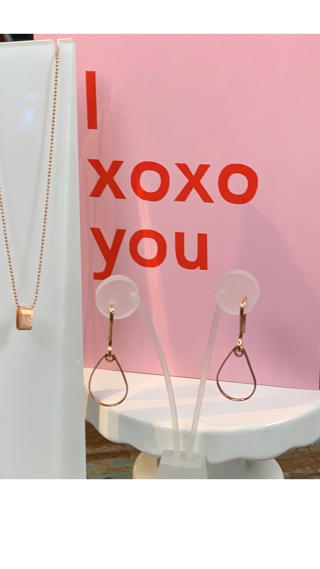 Minimalist style prevails in these open profile teardrops made of demi-fine,18K rose gold vermeil. The handmade, two-inch earrings hang just below the chin with hypo-allergenic ear wire guards to keep them in place. The earrings are handmade of sterling silver, then gilded with 18K rose gold. Demi-fine is also known as vermeil, which keeps its shine so you only have to clean the jewelry with a soft cloth.
