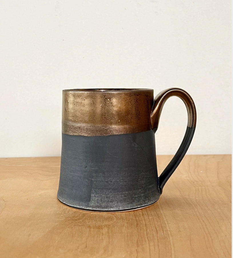 Sophisticated and grounded. This wheel-thrown mug pairs a deep matte black glaze with a warm, gold-dipped rim—a contrast of earth and metal that feels both modern and timeless. Finished with a clear glossy interior for everyday comfort and durability.