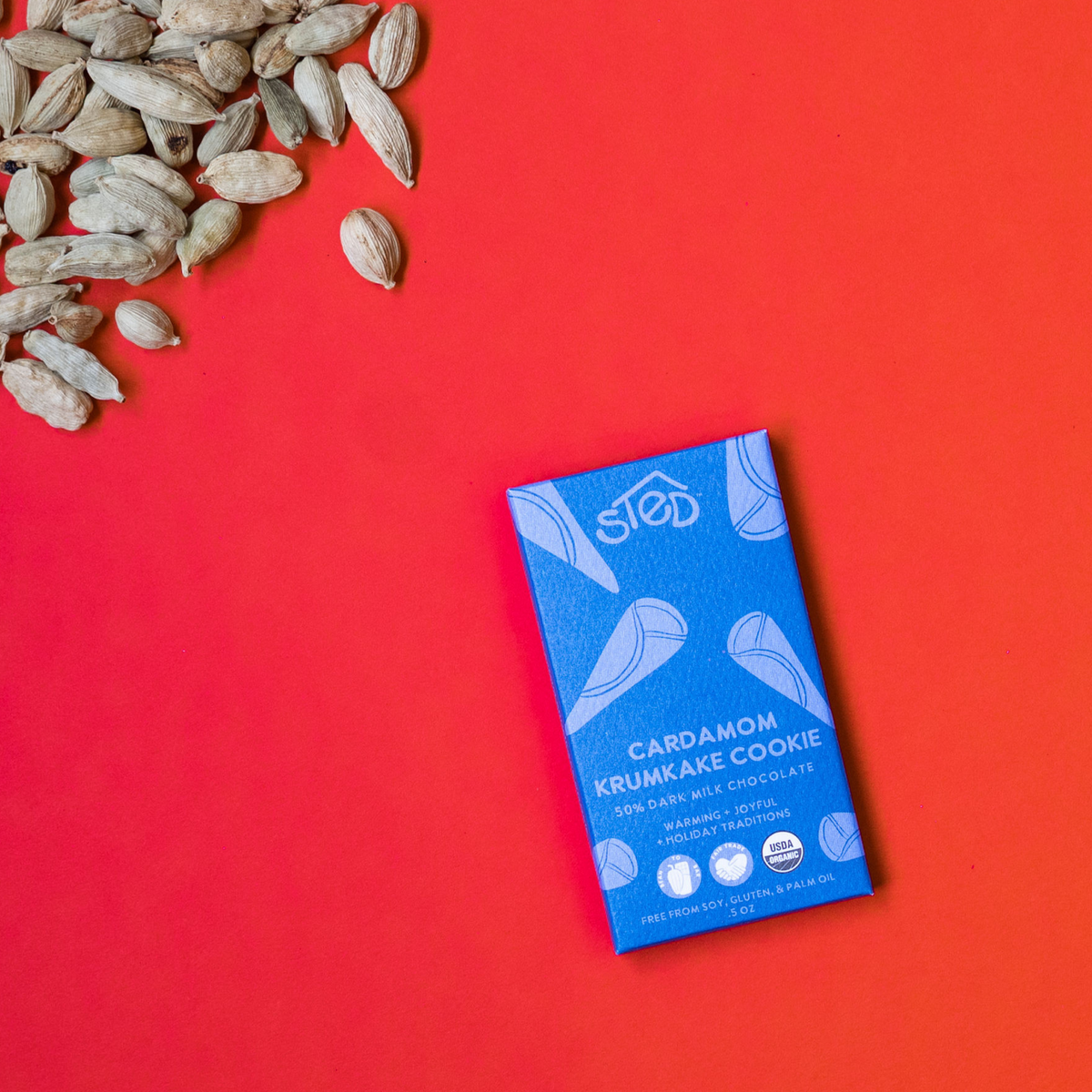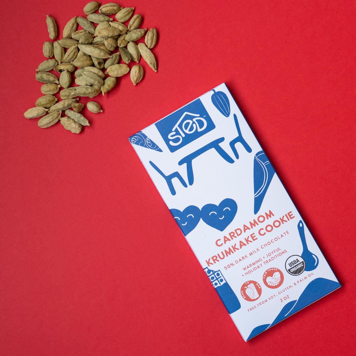 :: Contains- Organic cocoa beans, organic cane sugar, organic cocoa butter, organic milk powder, organic cardamom krumkake cookie crumbles (organic butter, organic sugar, organic white rice flour, organic tapioca starch, organic potato flour, organic molasses, baking soda, organic cinnamon, salt), organic cardamom essential oil.
