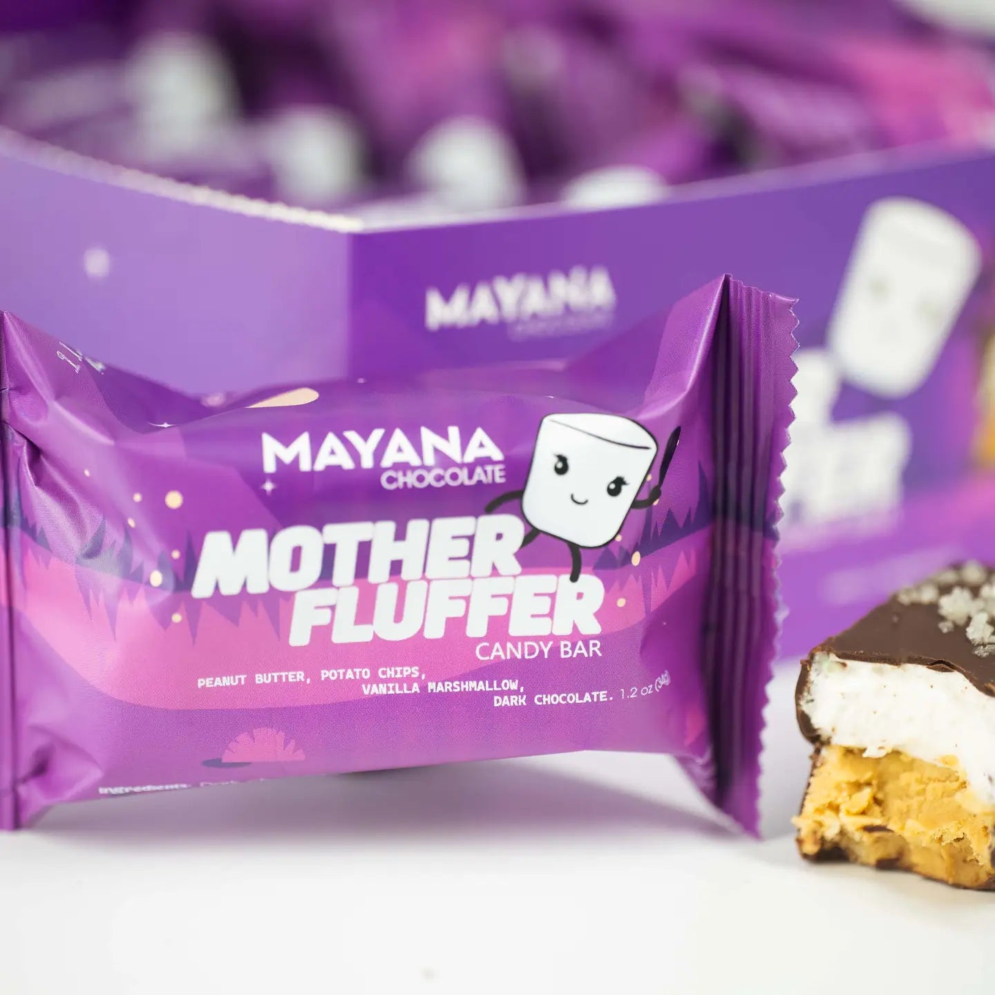Introducing Mother Fluffer, the ultimate candy bar experience from Mayana! This irresistible creation blends silky dark chocolate, creamy peanut butter, roasted white chocolate, crunchy potato chips, and a fluffy marshmallow layer. A sweet and salty explosion in every bite makes this more than just a treat- it’s an indulgent adventure for your taste buds. Dare to unwrap delight. Your snack game will never be the same!