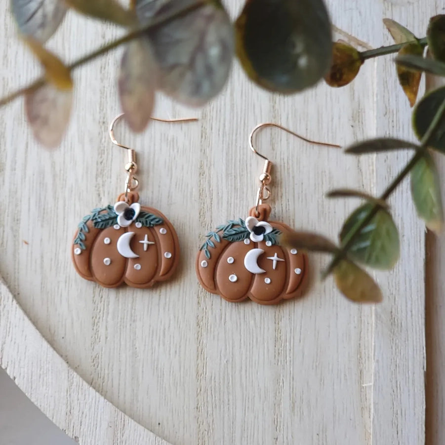 Embrace the cottagecore fall aesthetic with these handcrafted floral pumpkin dangle earrings. Delicately made from polymer clay, they add a charming touch to any autumn outfit. A perfect gift for her seasonal jewelry collection.