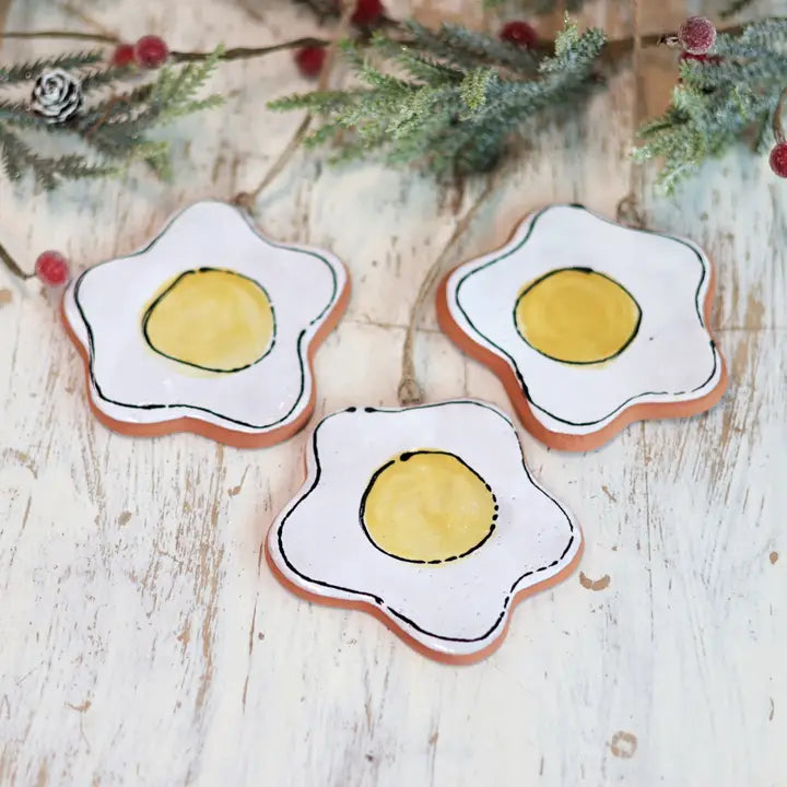 Each ornament is crafted using a 8th-century Majolica technique that Gravesco breakfast-ified for modern tastes. They start with earthenware clay, add three coats of glossy white glaze, then hand-paint each egg using watercolor-style washes in the perfect shade of weekend breakfast bliss. Those crispy edges and that golden yolk? All painted by hand, because they take their breakfast foods as seriously as a Southern grandmother takes her biscuit recipe.
