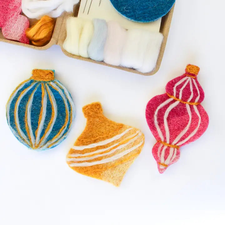 :: complete kit with wool baubles, felting needles, soy-based foam pad, and yarn for hanging