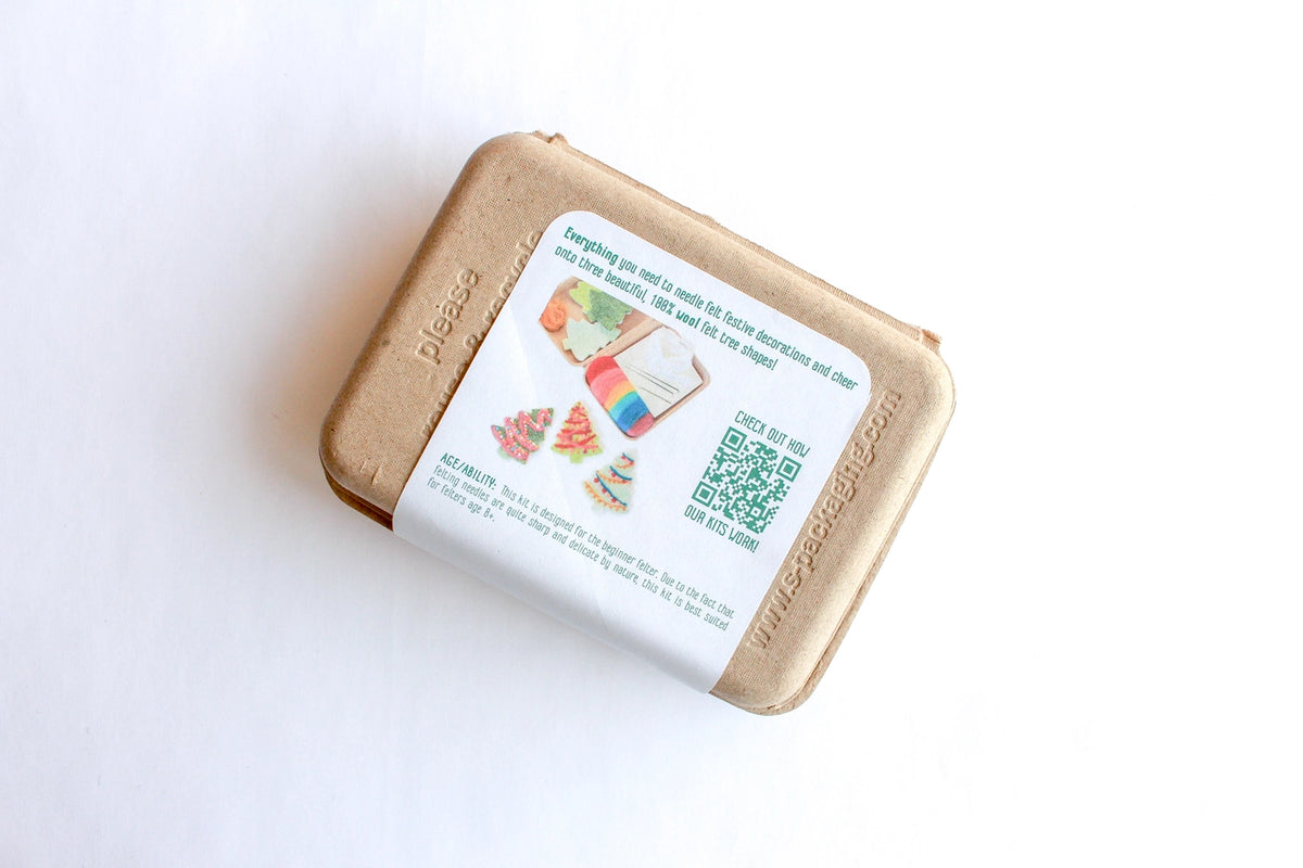 :: complete kit with wool tree shapes, felting needles, soy-based foam pad, and yarn for hanging