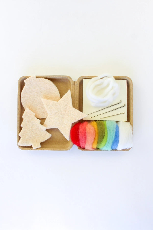 :: complete kit with wool cookie shapes, felting needles, soy-based foam pad, and yarn for hanging