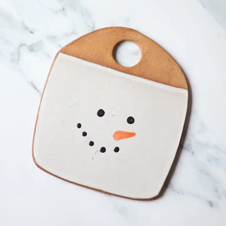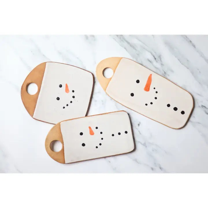 Each cheese board is made by hand then the melted snowman is hand painted with glaze before firing. No two will be the same shape and each will have a completely unique face.