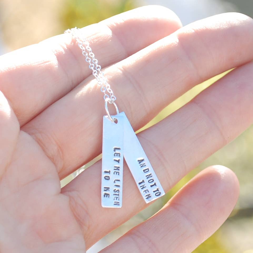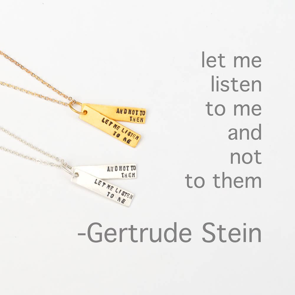 A motivational quote necklace reminds the wearer to “Let me listen to me and not to them.” Words from the famous independent woman writer, Gertrude Stein.