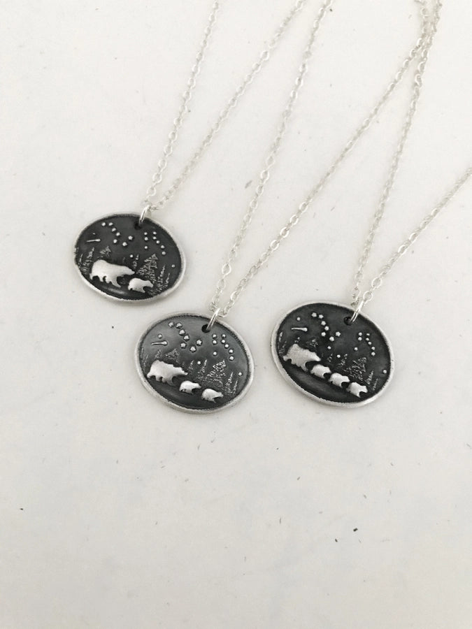 Show your love and fierce protection for your children with this adorable Mama Bear and Baby Bear charm necklace. Wandering the woods under the Stars, you can see the Big Dipper and Little Dipper in the distance.
