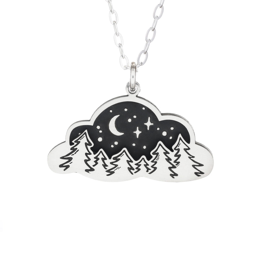 A sterling silver necklace displaying a pine tree forest under a night sky in the shape of a cloud.