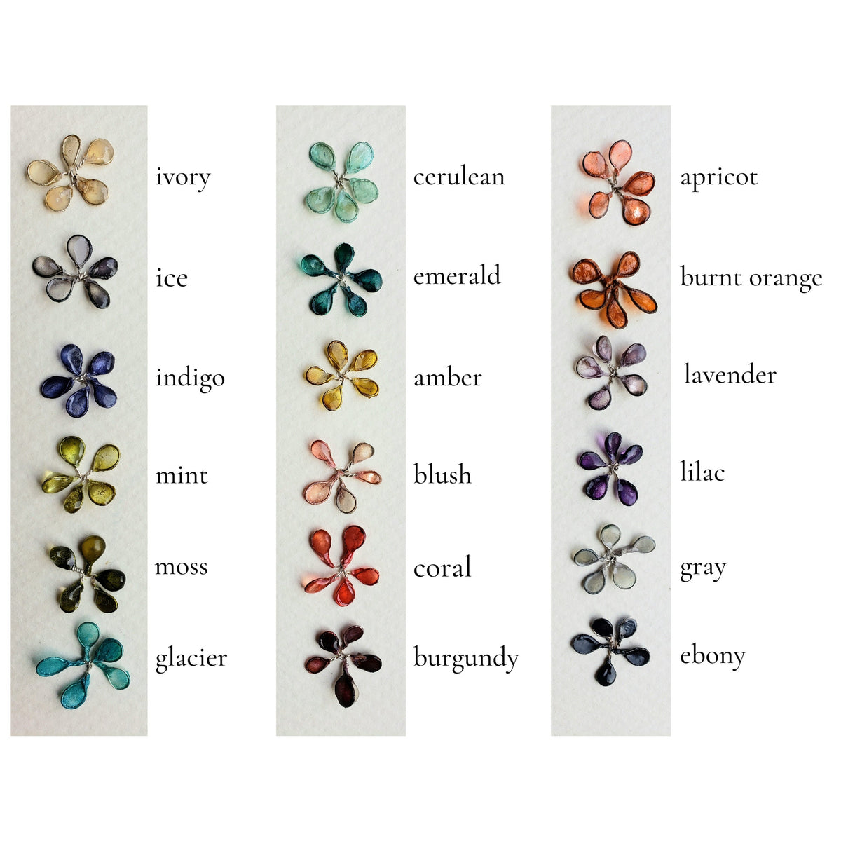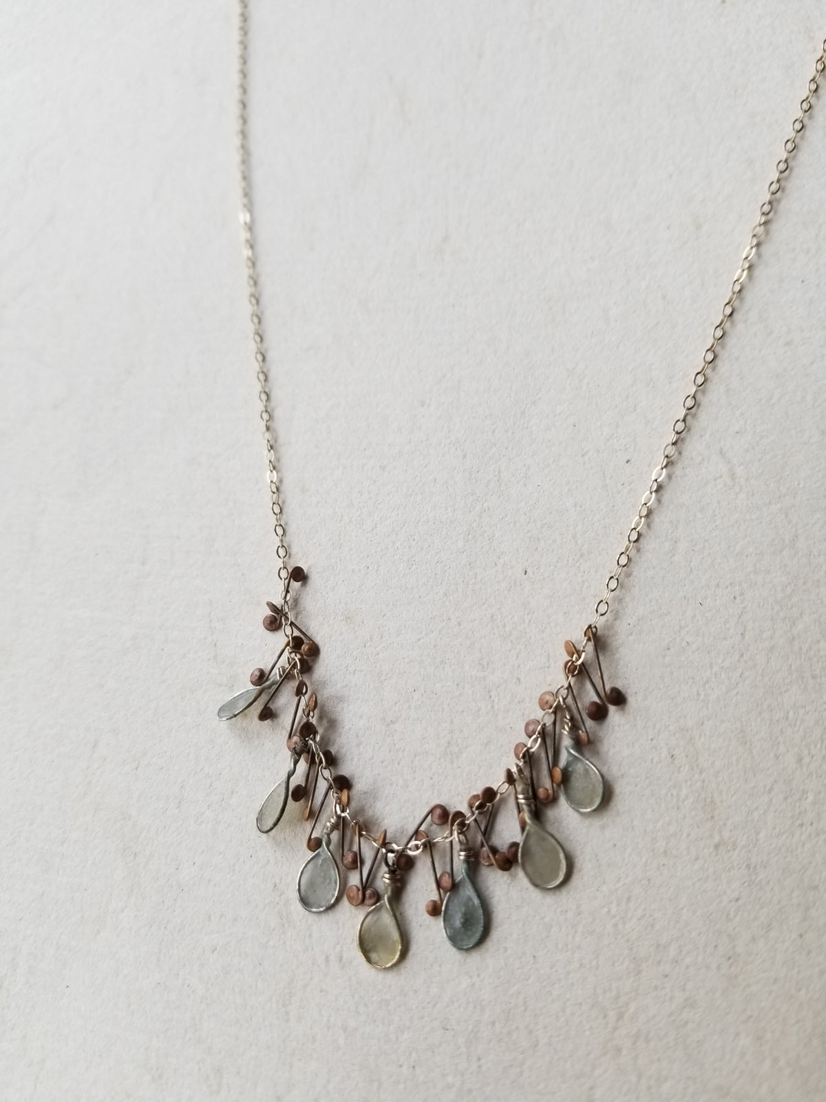 Sterling silver chain and clasp, with melted silver drops. The dewdrops are sterling silver and handmade paper, hand-dyed, and coated in resin to make them waterproof and durable. On an adjustable 16" to 18" sterling silver chain.