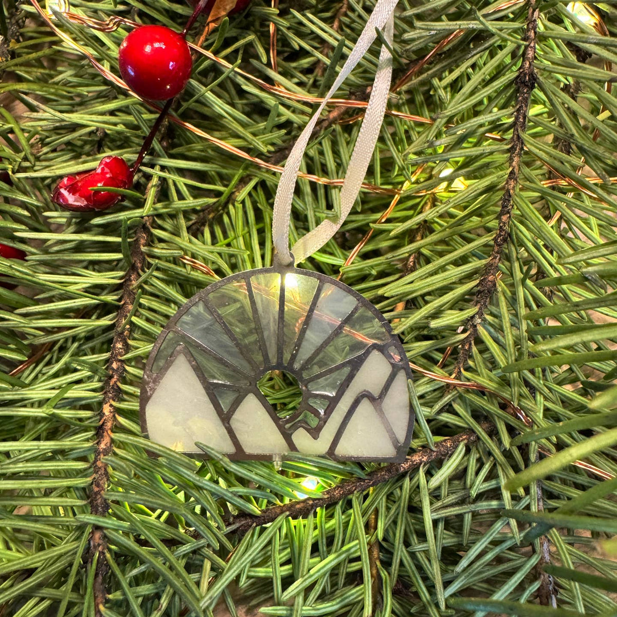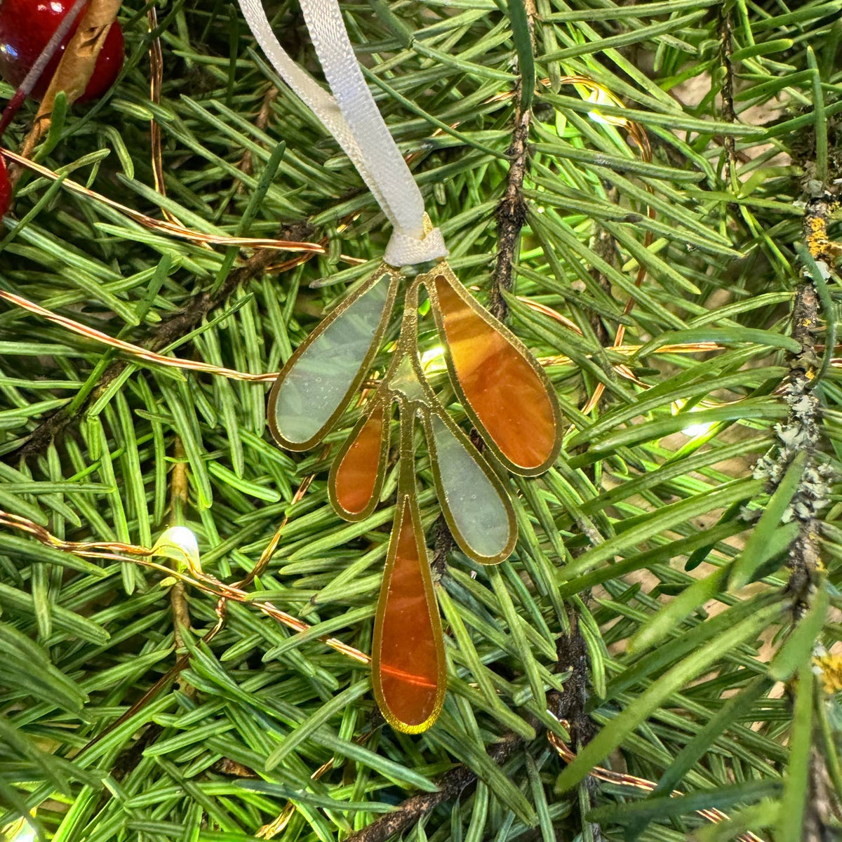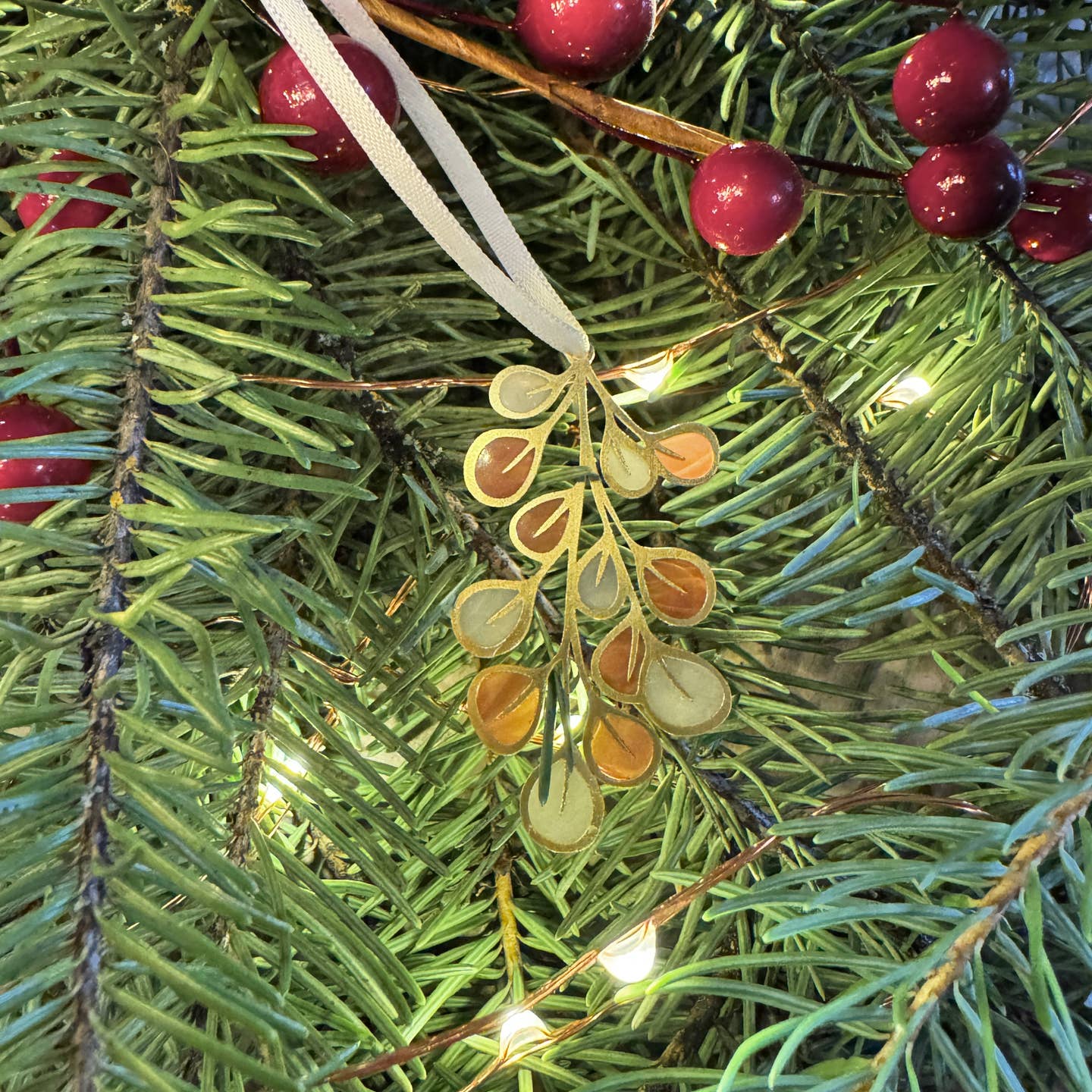 This delicate brass ornament, designed in a stained glass style, sparkles beautifully when it catches the light on your tree. Hung from a soft ivory satin ribbon, it makes a charming holiday gift or a treasured keepsake.