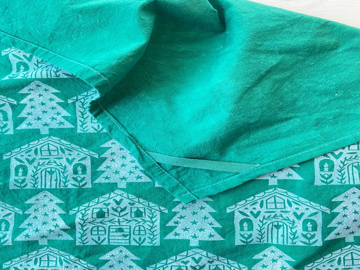 Hand-printed cabins and trees on a hand-dyed cotton towel.