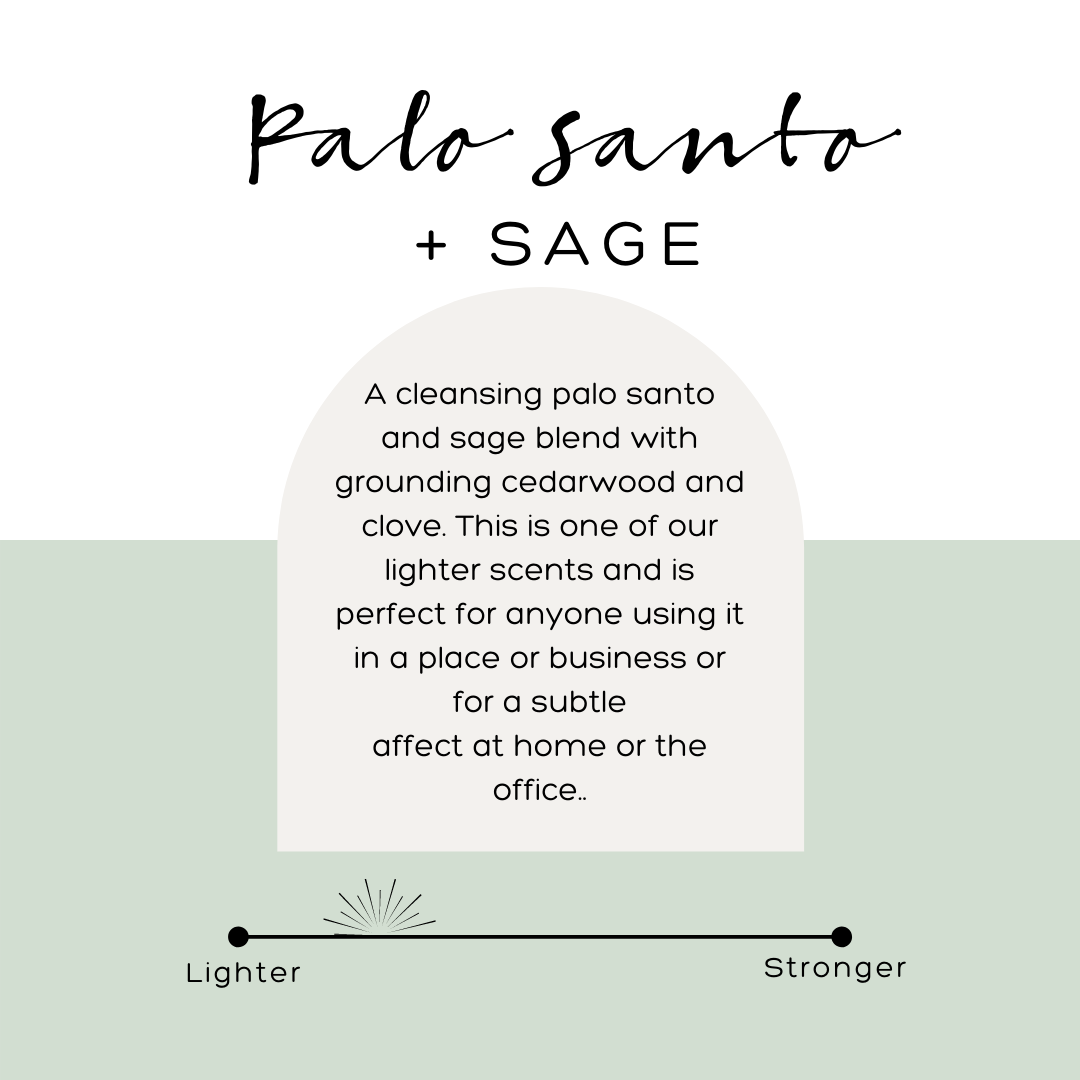 100% natural. A cleansing palo santo and sage blend with grounding cedarwood and clove. This is one of our lighter scents and is perfect for anyone using it in a place or business or for a subtle effect at home.