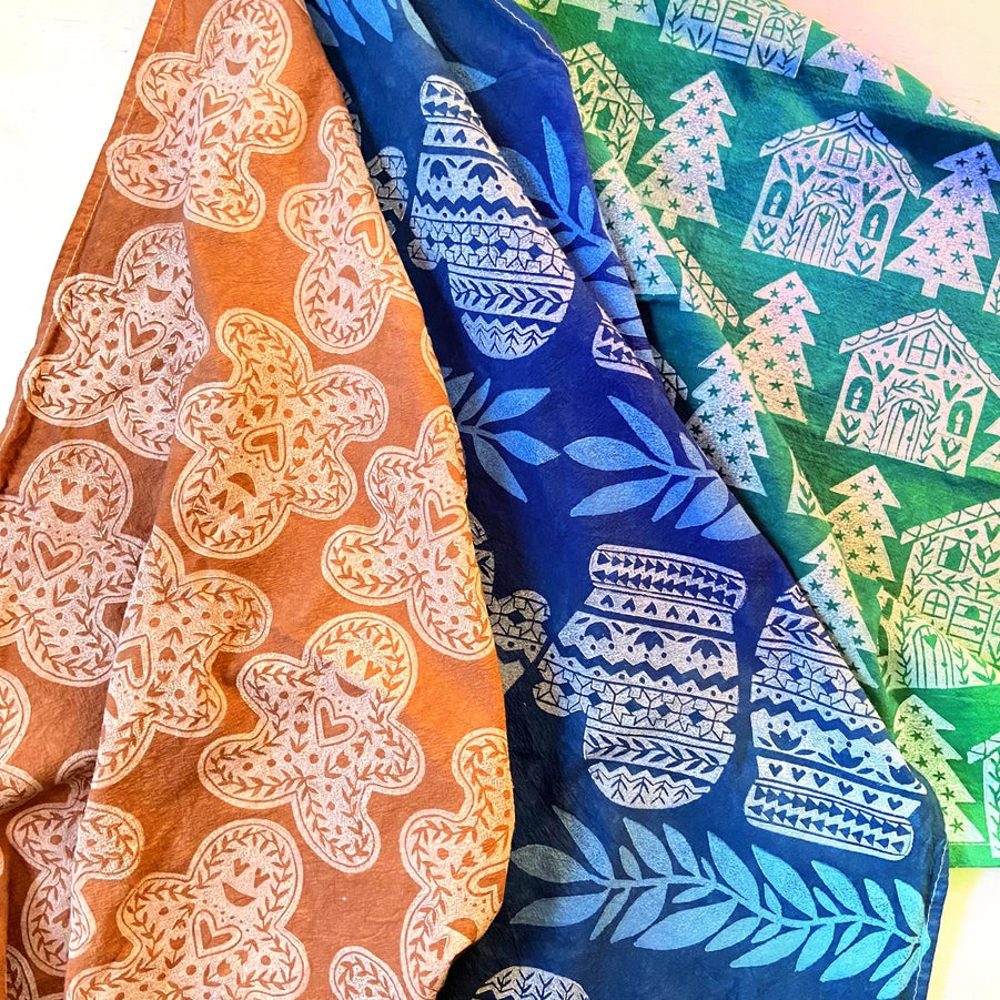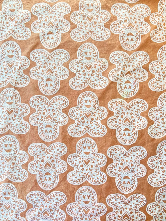 Hand-printed gingerbread people on a hand-dyed cotton towel.