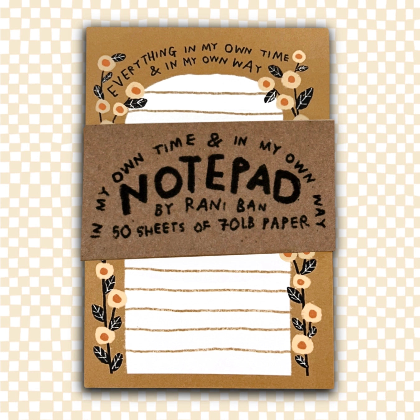 A new take on a familiar favorite. This notepad features the same gentle message as our beloved prints and stickers, now in list-making form. This cute and sturdy notepad is shipped plastic-free with a hand-lettered eco-wrap.