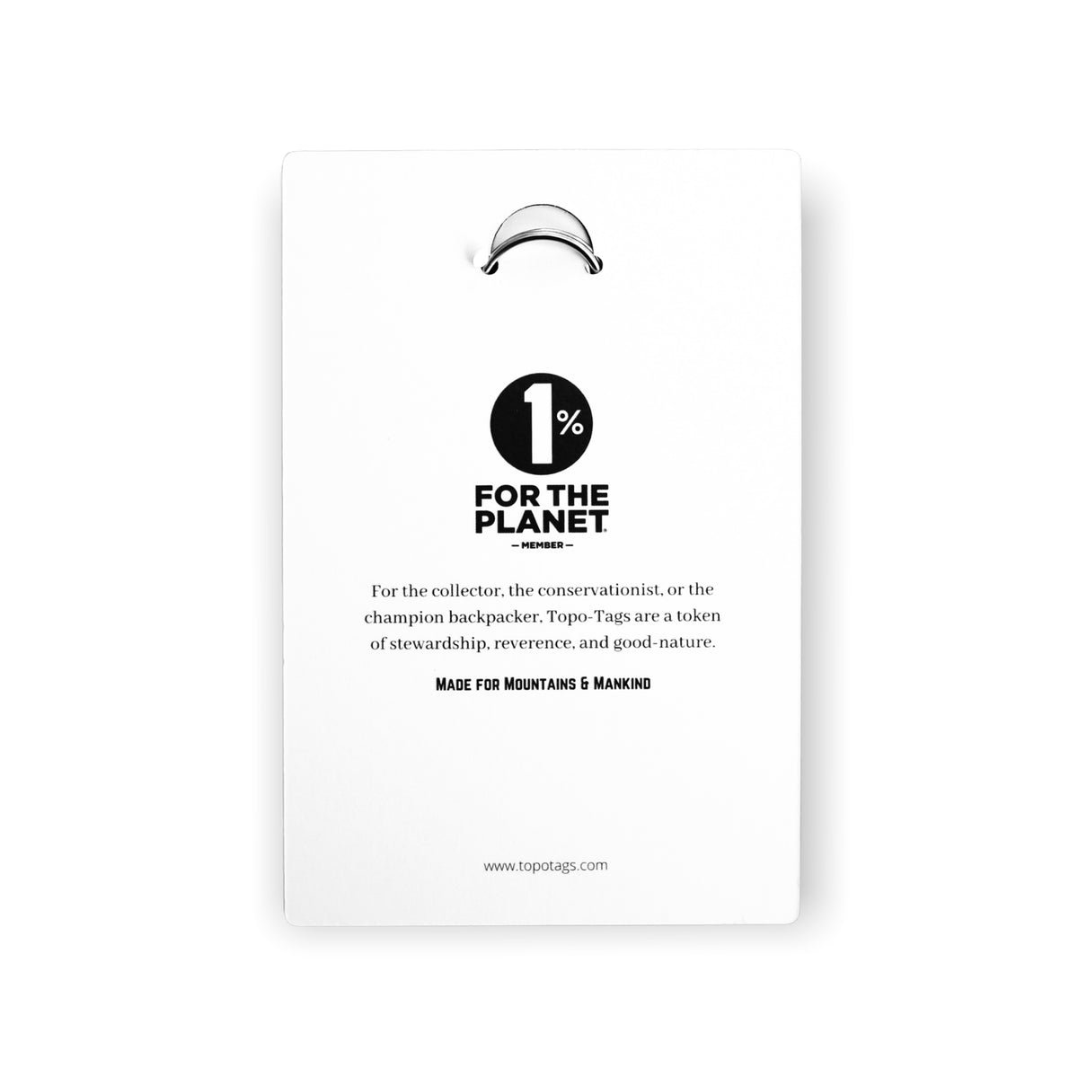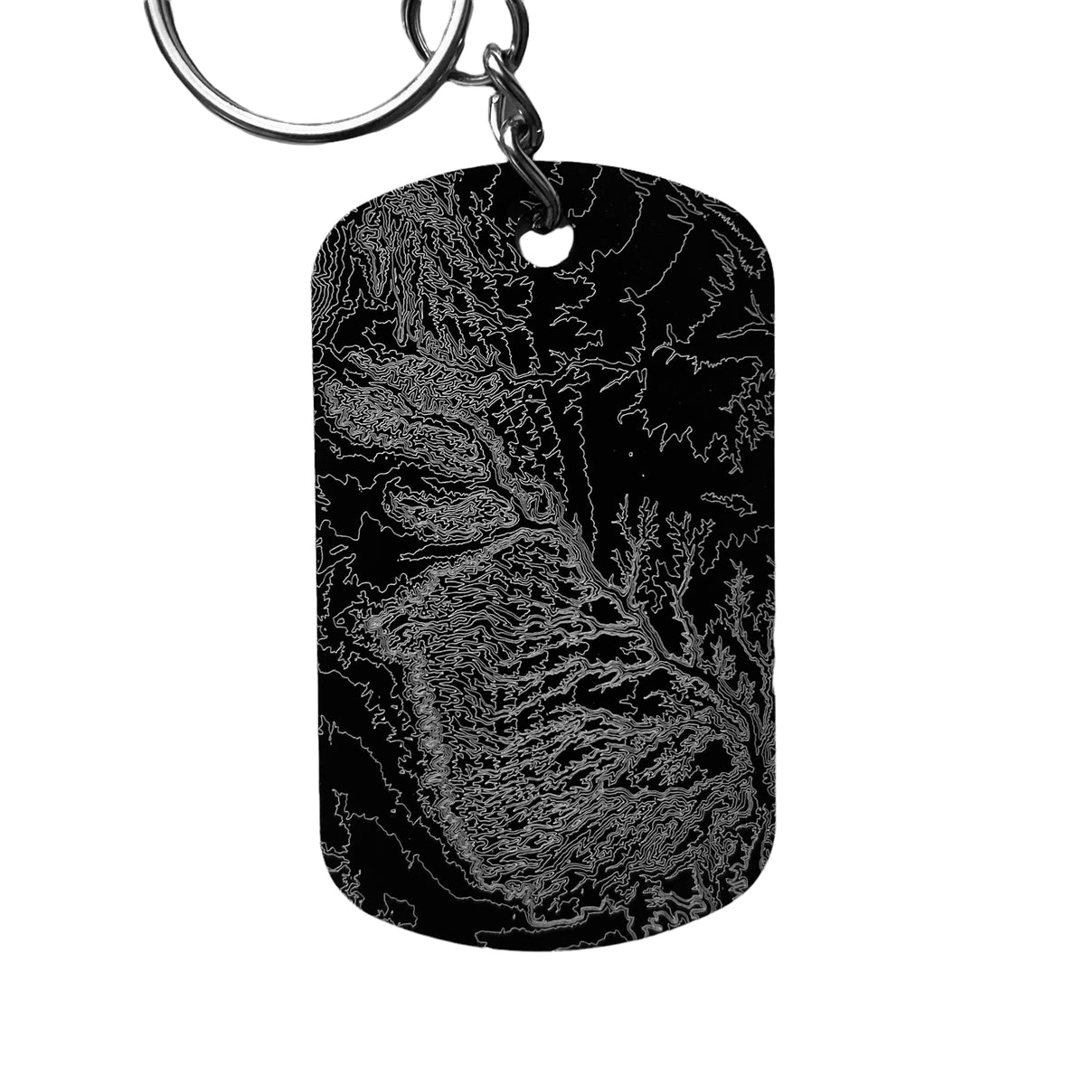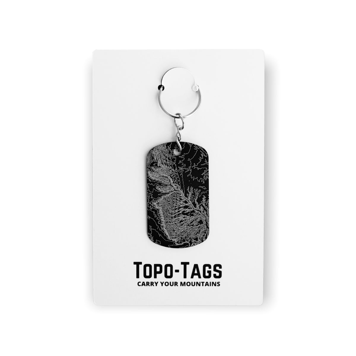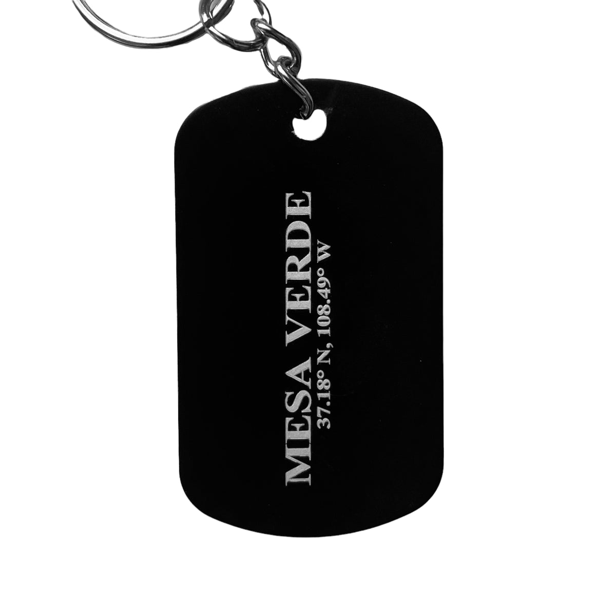 A topographical keychain of Mesa Verde National Park. Each tag is made of aluminum, and engraved with the map of the national park on one side and the map coordinates of the location on the other.