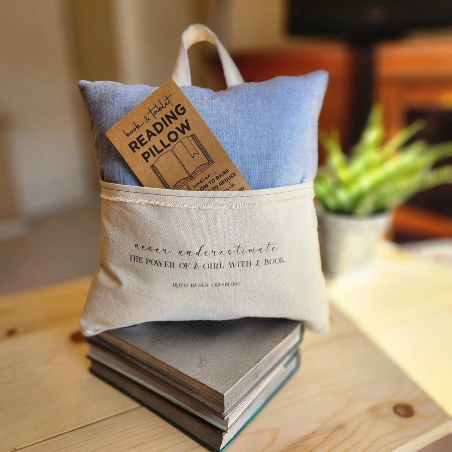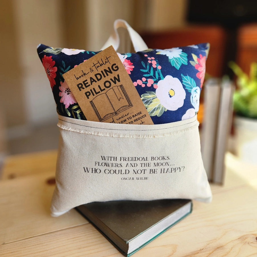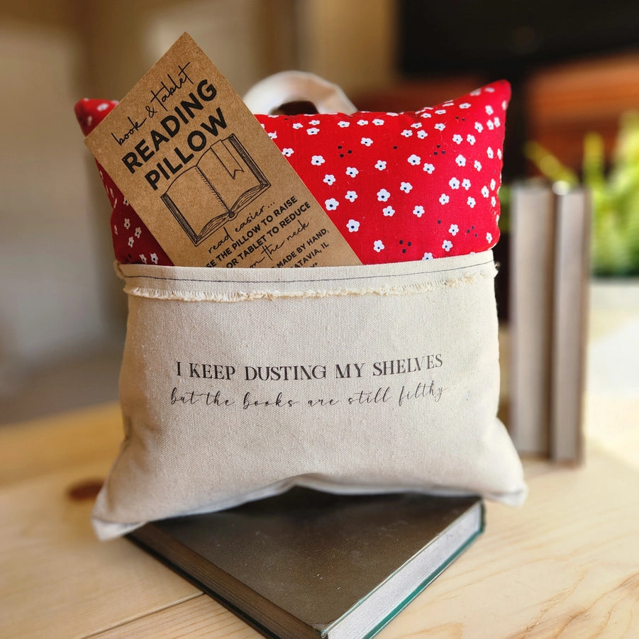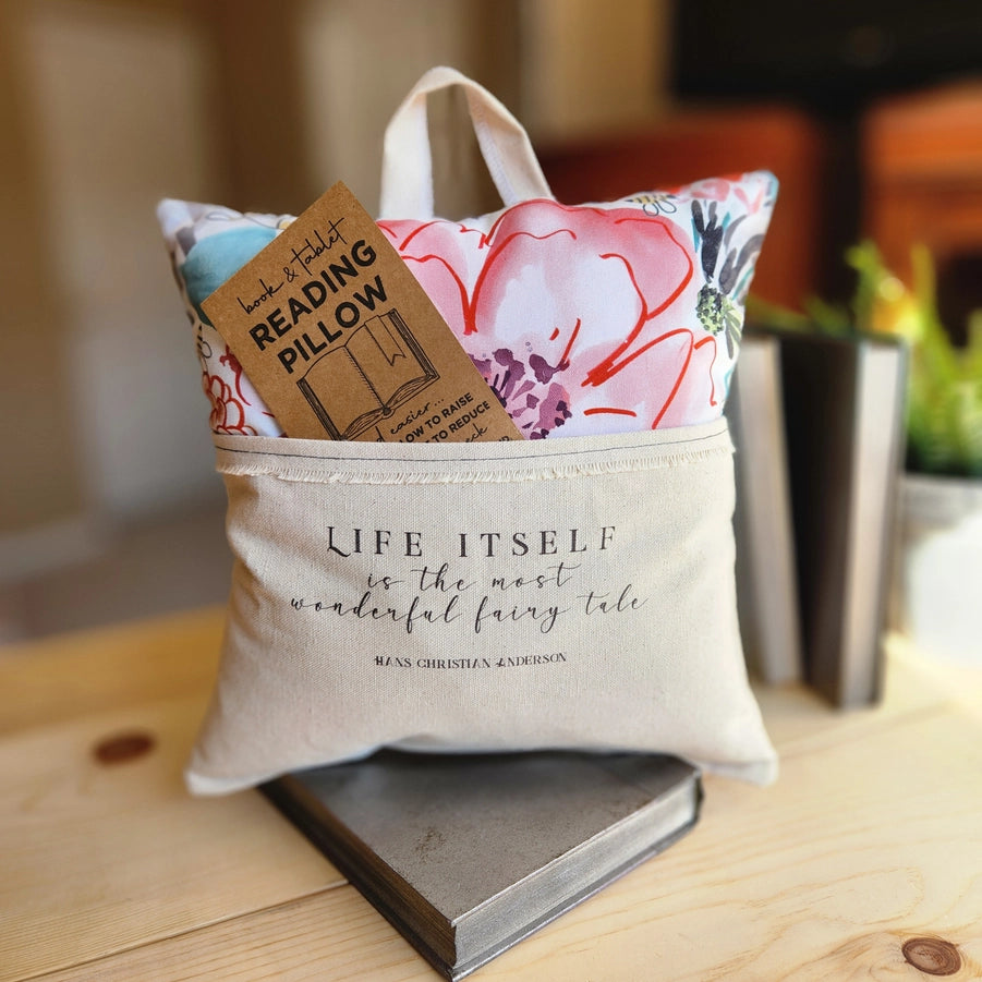 The 12x12 pillow is hand-stuffed with polyfill and features a pocket for a book, pair of glasses, e-reader, or tablet. The back, pocket, and handle are made with durable canvas. A patterned fabric and reading reading-related quote embellish the front.