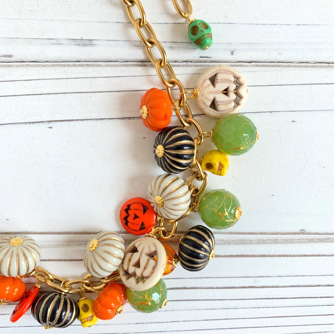 Loads of baubles on this dangling pumpkin charm necklace that's a perfect fall necklace, and Halloween accessory!