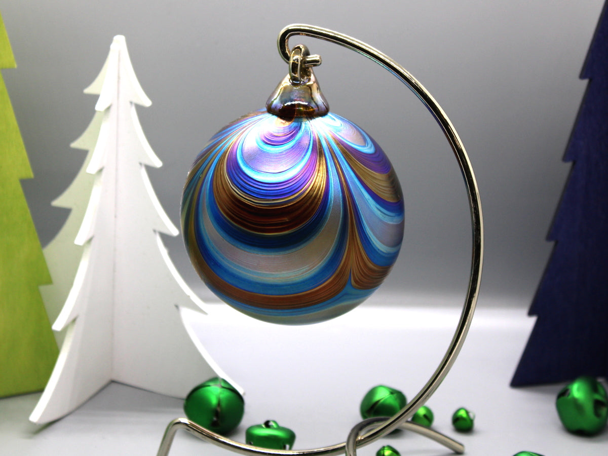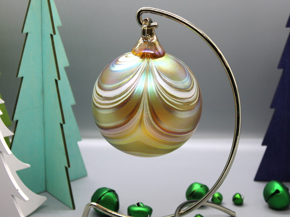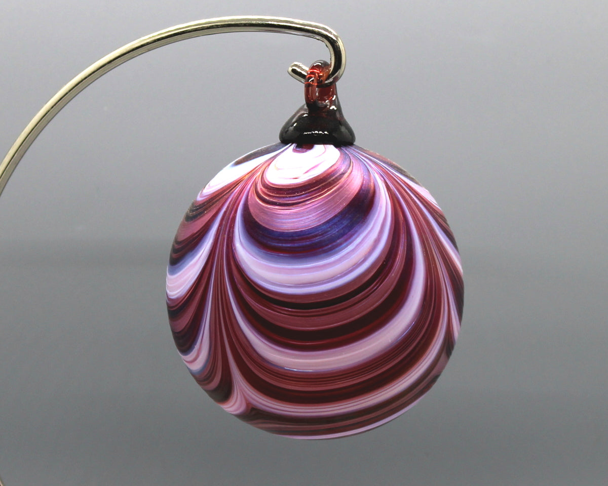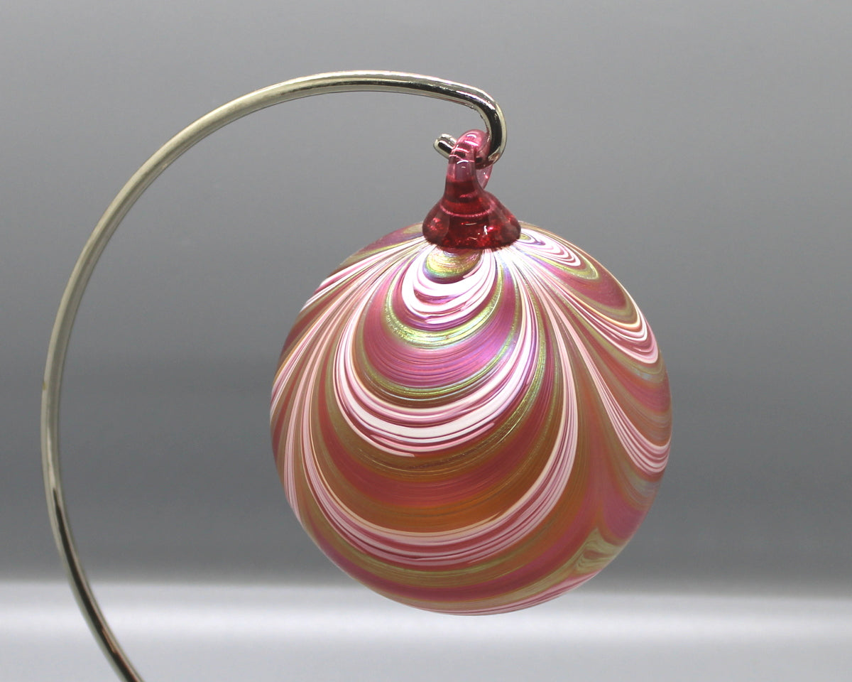 The Furnace's perennially-popular RIBBON-patterned orb features ribbons of color undulating across the surface like swags of seasonal fabric draped across the mantle. A colored-glass hook tops each orb; the body is given a luster-like finish to set it apart from "the usual."