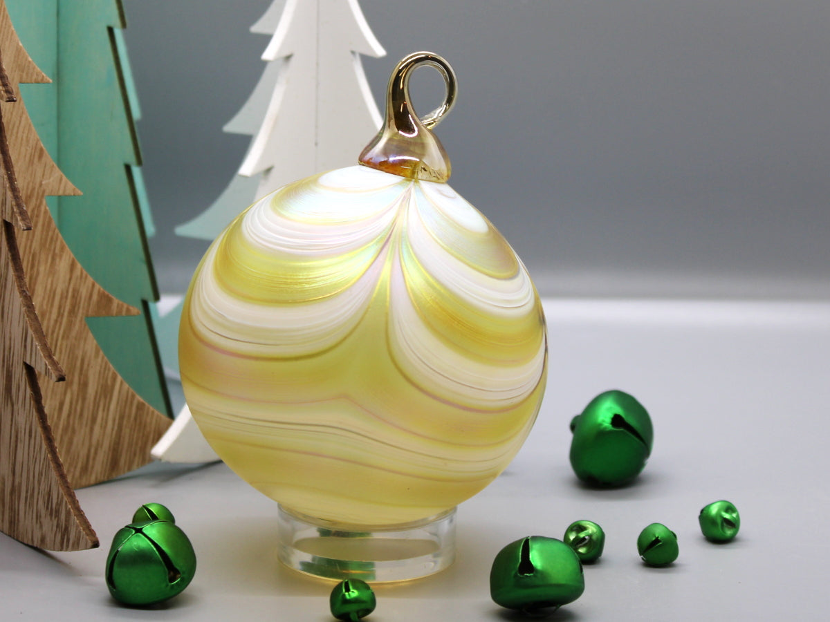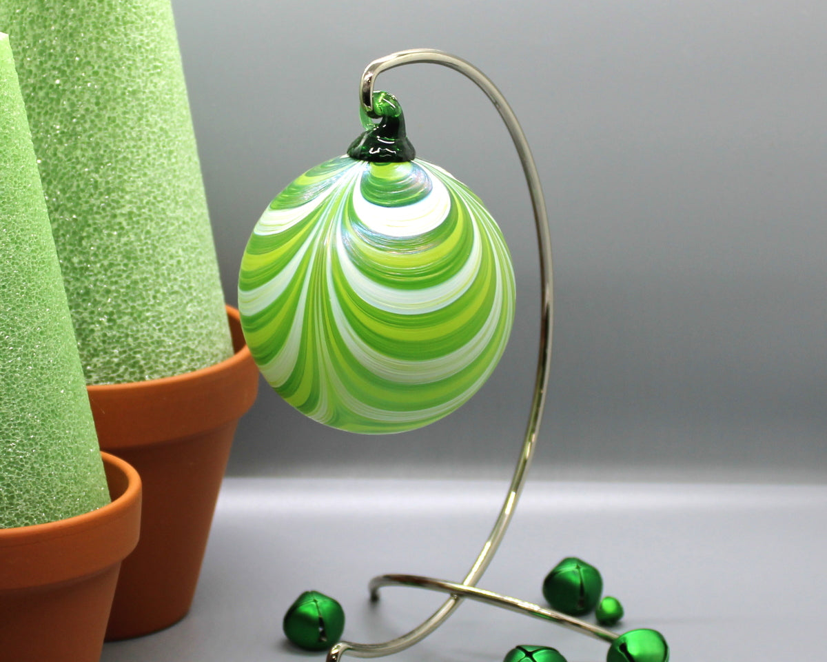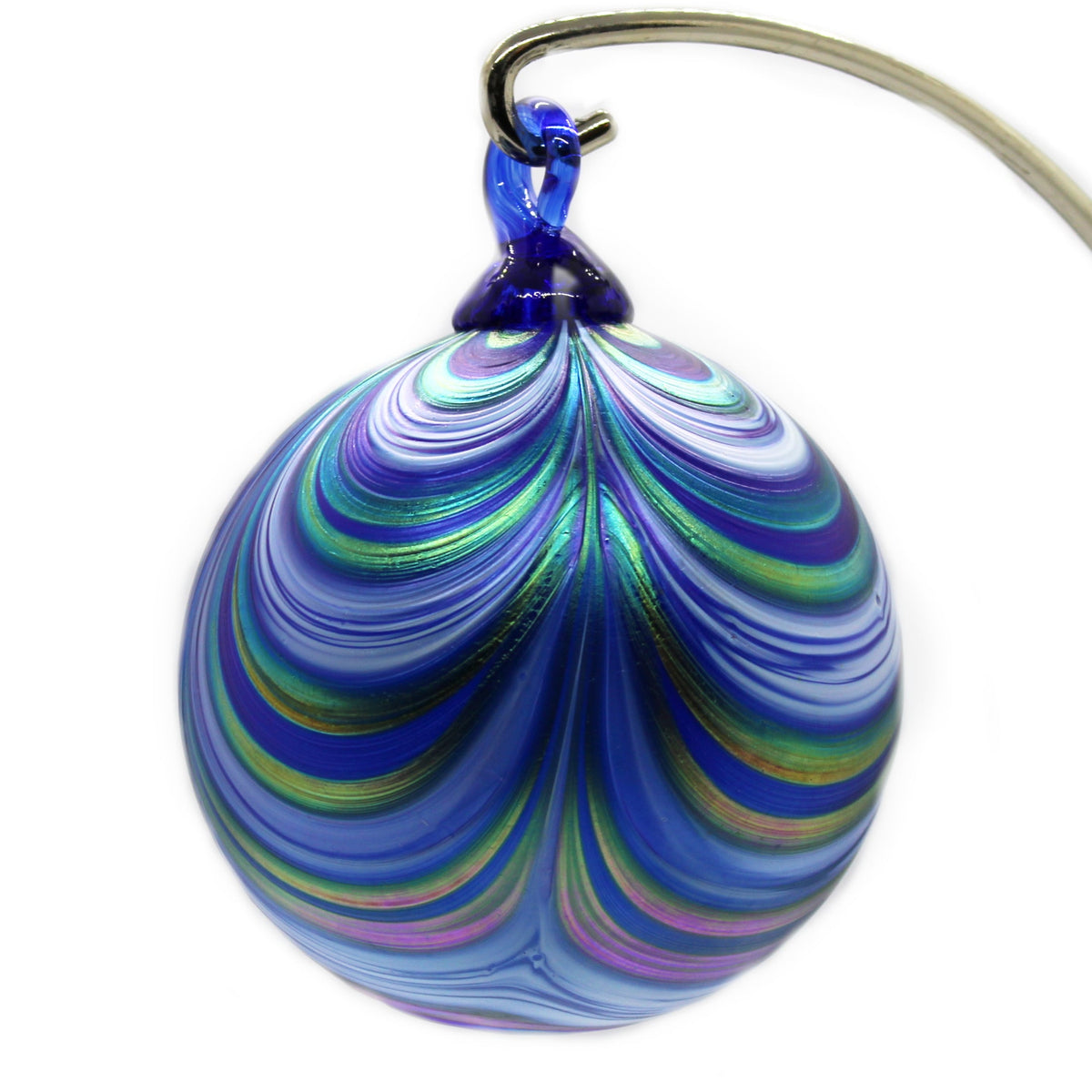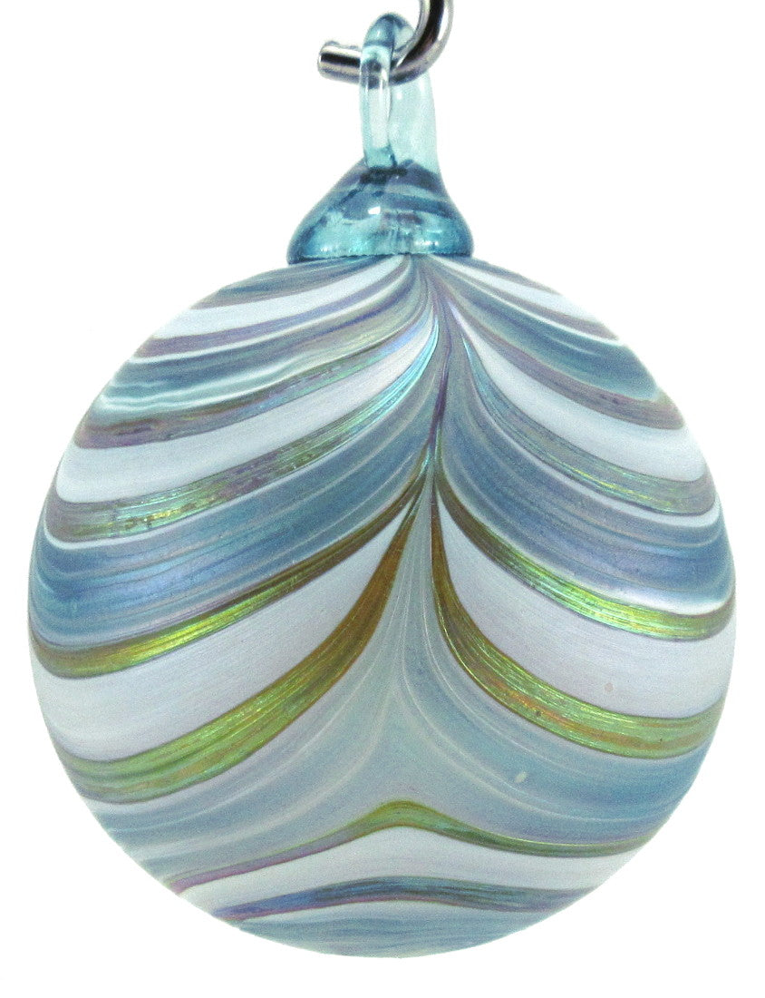 The Furnace's perennially-popular RIBBON-patterned orb features ribbons of color undulating across the surface like swags of seasonal fabric draped across the mantle. A colored-glass hook tops each orb; the body is given a luster-like finish to set it apart from "the usual."