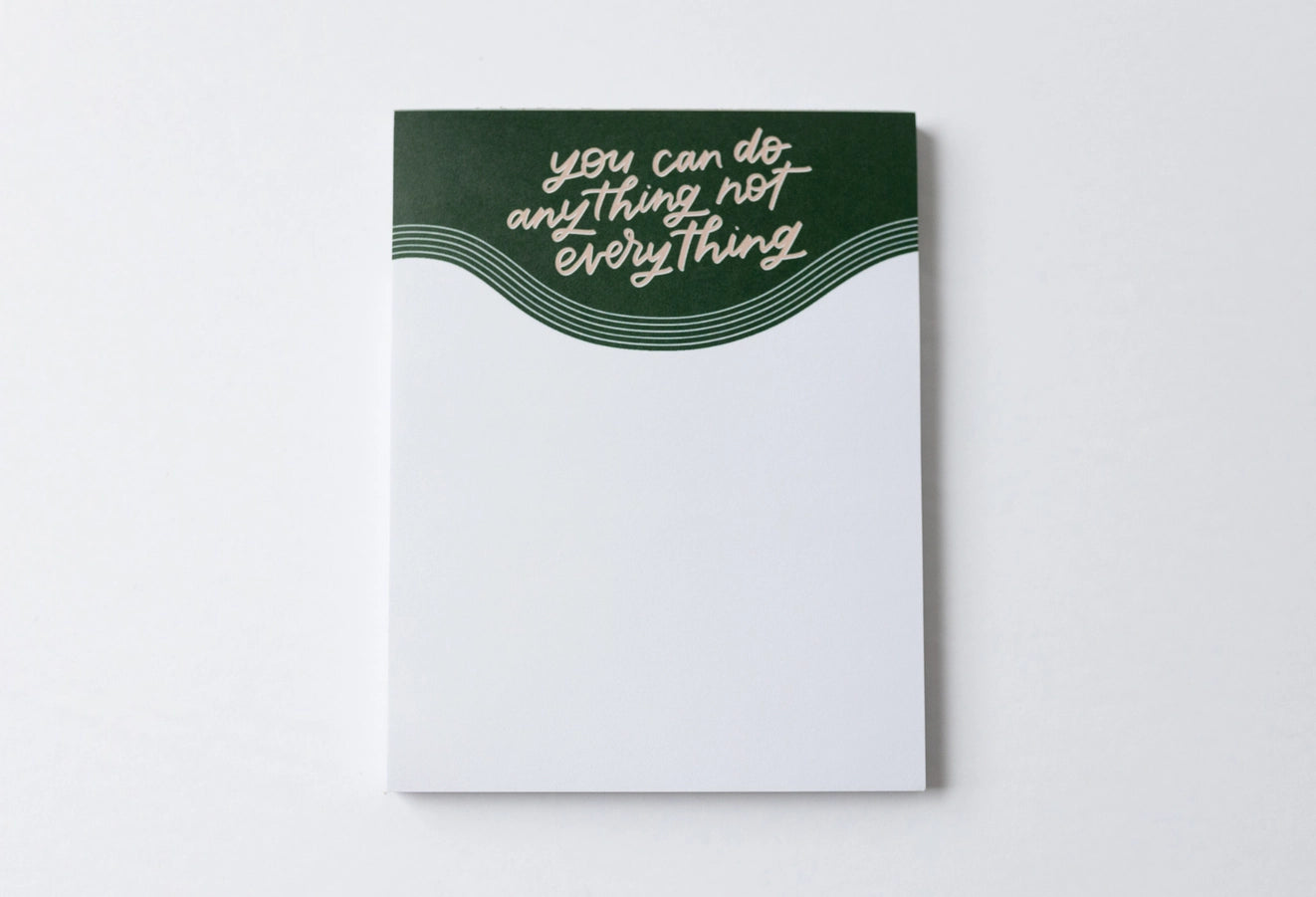 A gentle reminder wrapped in rich green and soft blush lettering. This “You Can Do Anything, Not Everything” notepad brings a little calm to the chaos—perfect for lists, thoughts, and moments when you need encouragement right at your desk. Simple, grounding, and beautifully made.